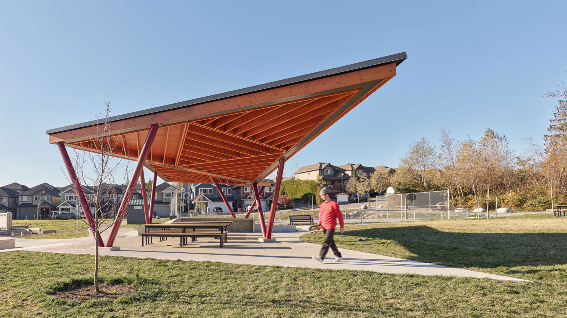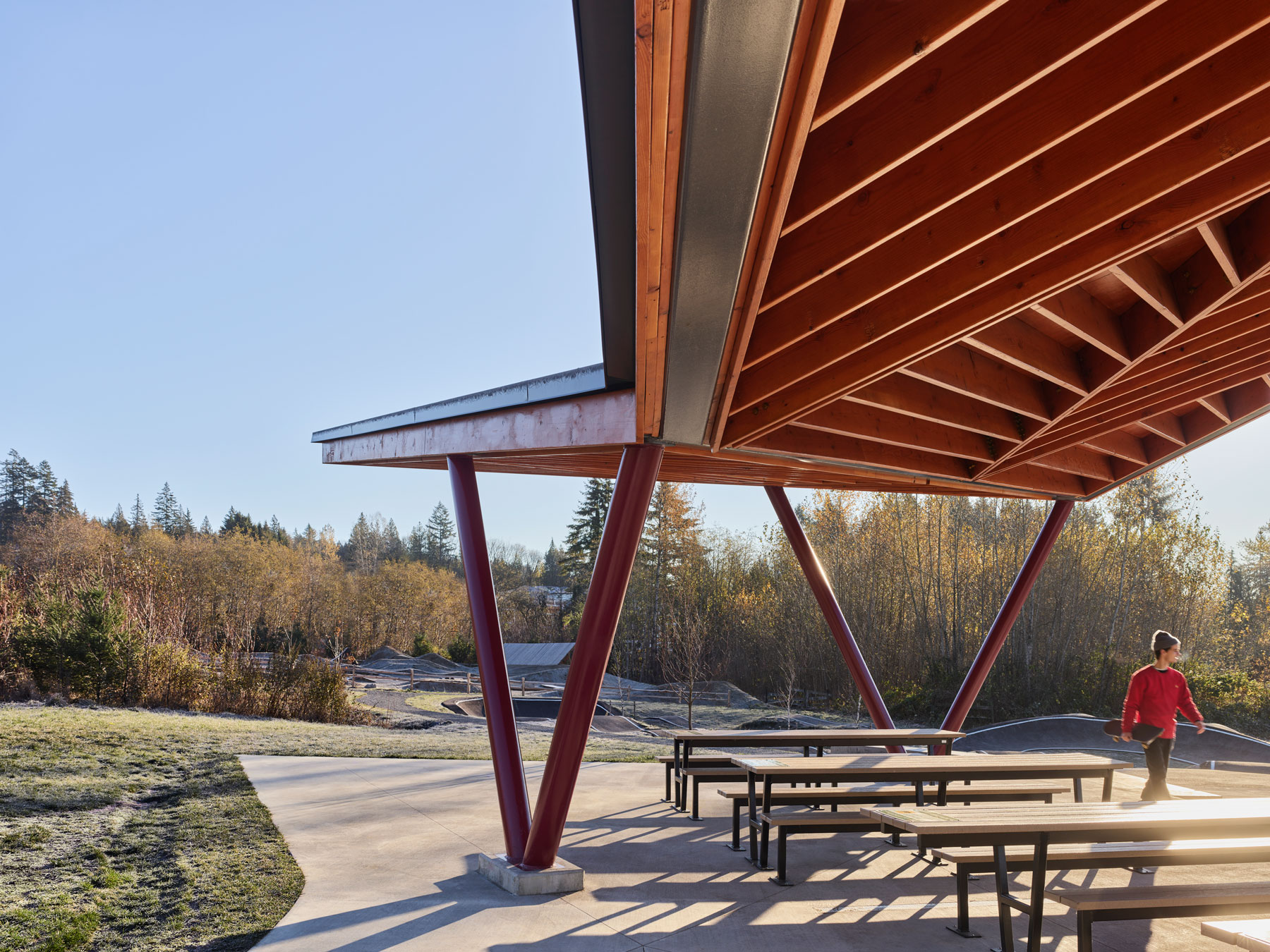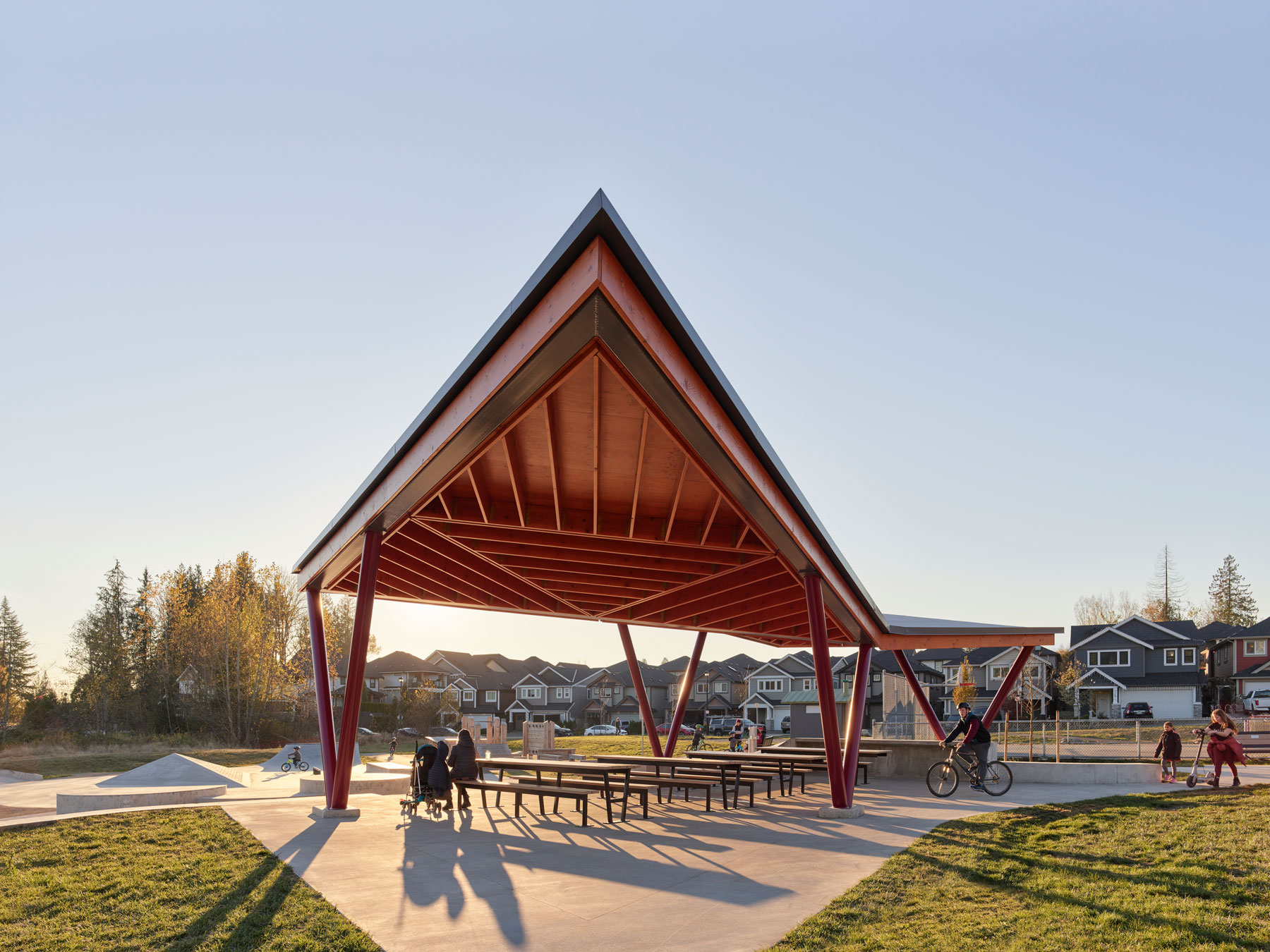 This pavilion is the centerpiece of a new youth action park in a growing community in Maple Ridge. Surrounded by parkour course, pump track, sport court, and skate park, the wood and steel structure is a dynamic armature providing a covered gathering space. The unique geometry is formed by two counterbalanced triangles resting on four V-shaped supports. MIZA was retained for full architectural services through design and construction as a sub-consultant to the prime consultant landscape architect/civil engineer (Binnie).
