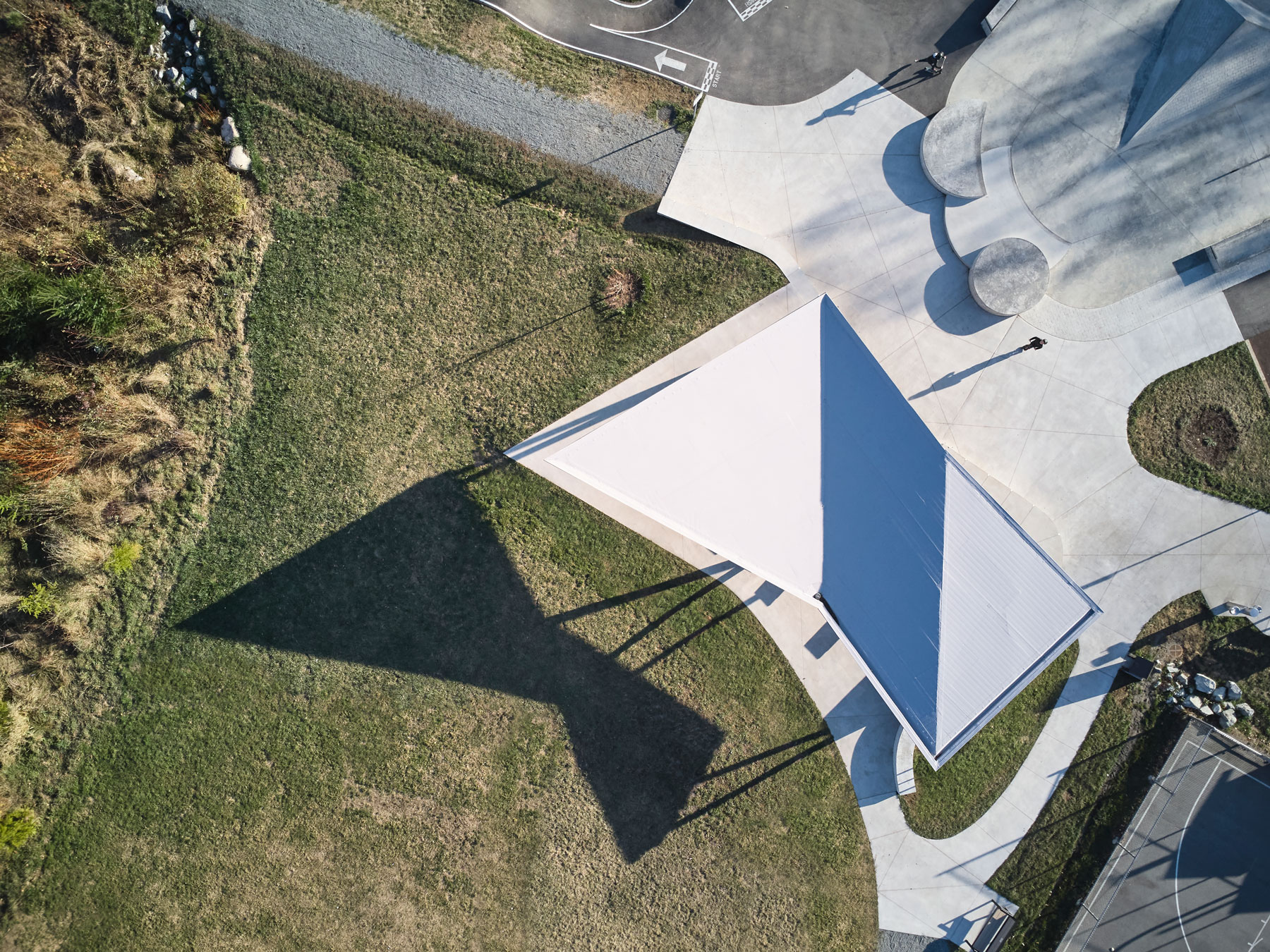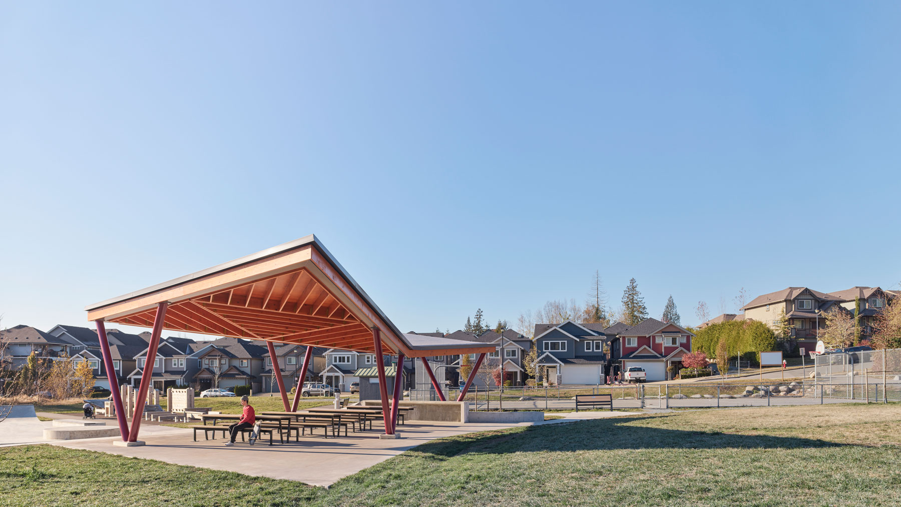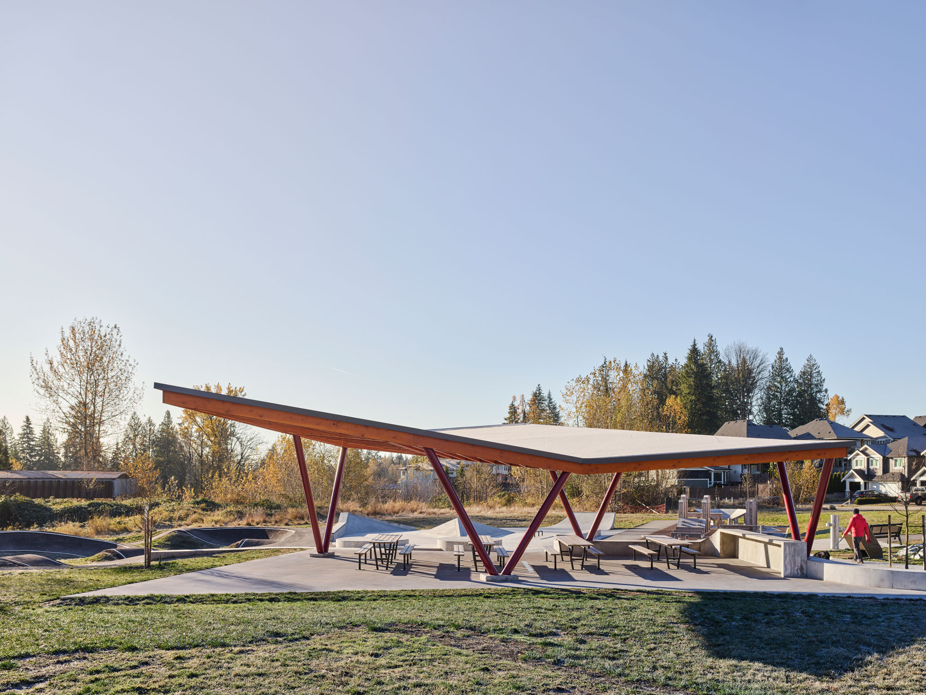 This pavilion is the centerpiece of a new youth action park in a growing community in Maple Ridge. Surrounded by parkour course, pump track, sport court, and skate park, the wood and steel structure is a dynamic armature providing a covered gathering space. The unique geometry is formed by two counterbalanced triangles resting on four V-shaped supports. MIZA was retained for full architectural services through design and construction as a sub-consultant to the prime consultant landscape architect/civil engineer (Binnie).